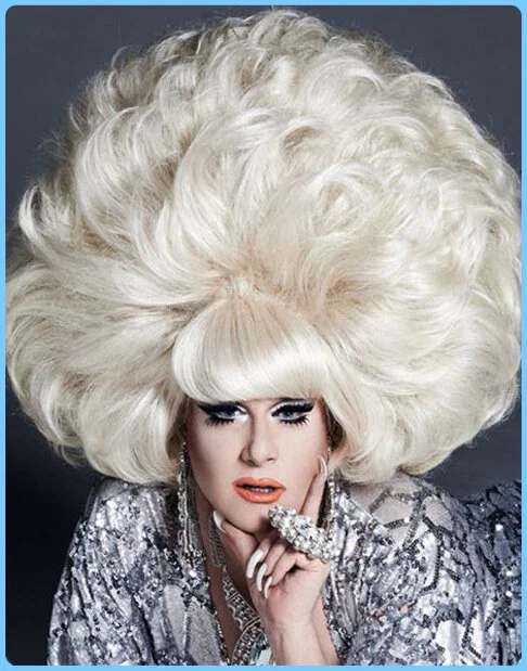 A psychedelic whirl of thigh-skimming op art prints, frosted lips, double false eyelashes and “pounds of paint” beneath a thunderhead of blonde wigs, Lady Bunny is not only gloriously glamorous and devastatingly funny, but a firmly established comic queen in a league of her own.